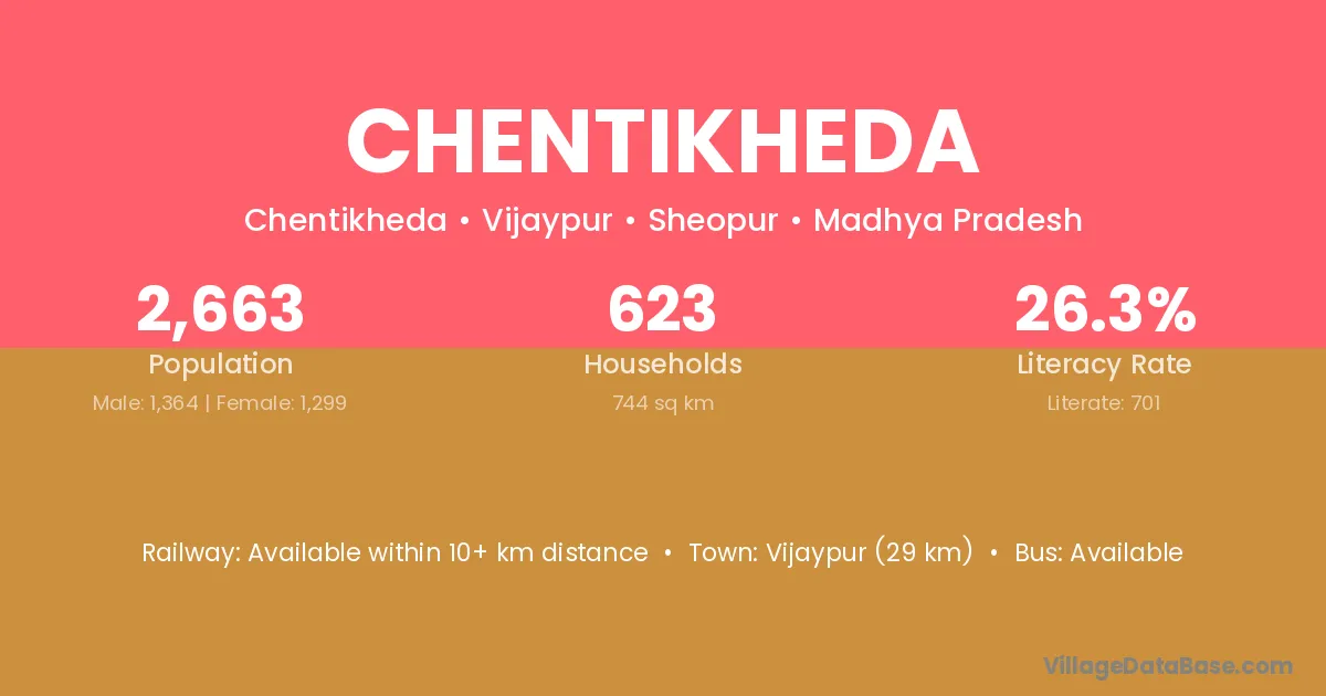 Vijaypur (29 km) is the nearest town to Chentikheda village for major economic activities and is located approximately 29 km away.