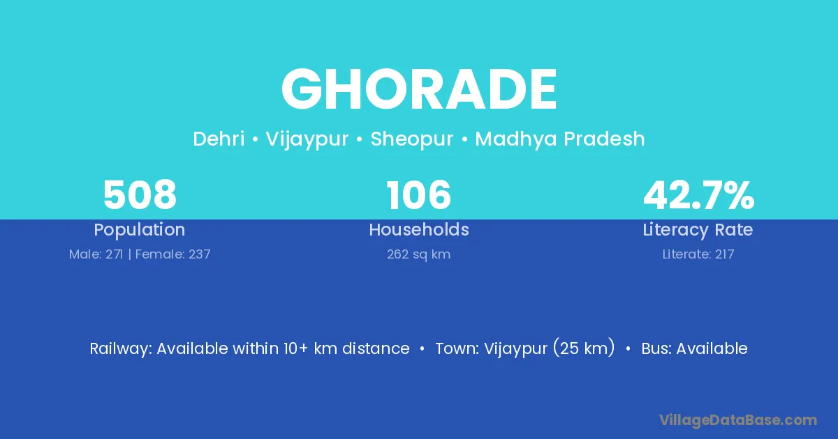 Vijaypur (25 km) is the nearest town to Ghorade village for major economic activities and is located approximately 25 km away.