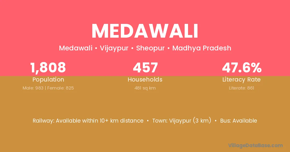 Vijaypur (3 km) is the nearest town to Medawali village for major economic activities and is located approximately 3 km away.