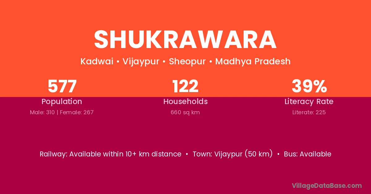 Vijaypur (50 km) is the nearest town to Shukrawara village for major economic activities and is located approximately 50 km away.