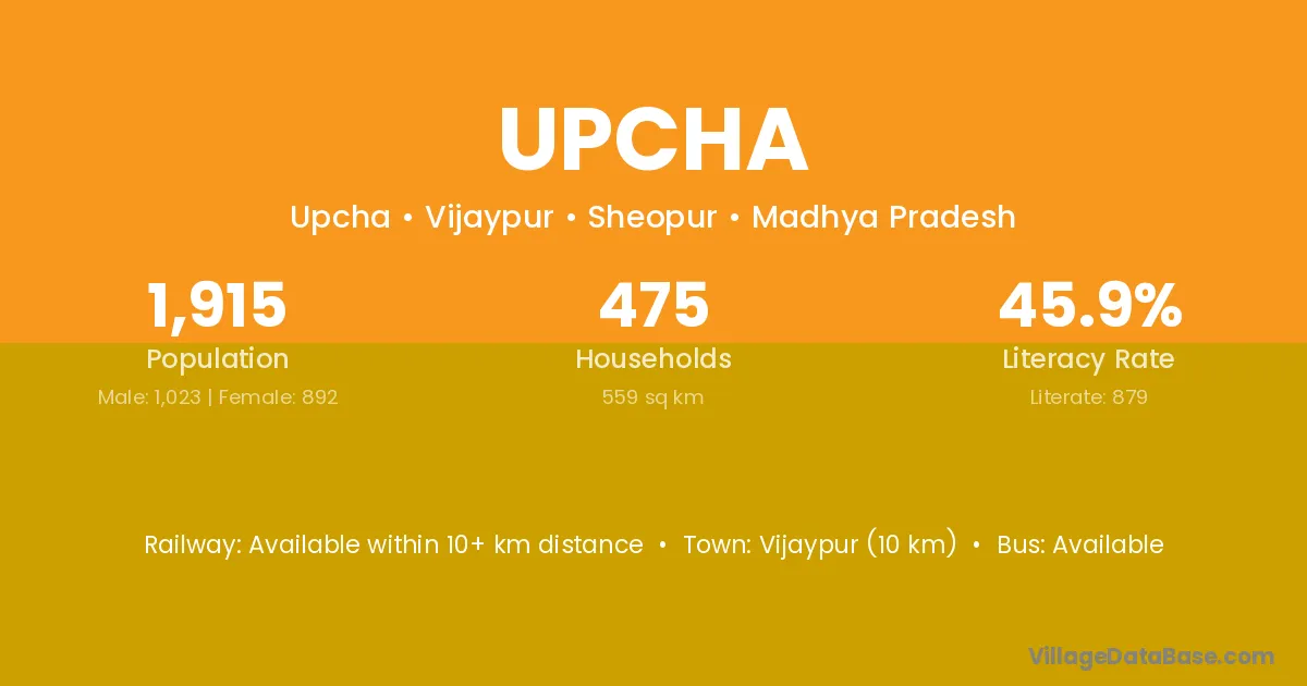 Vijaypur (10 km) is the nearest town to Upcha village for major economic activities and is located approximately 10 km away.