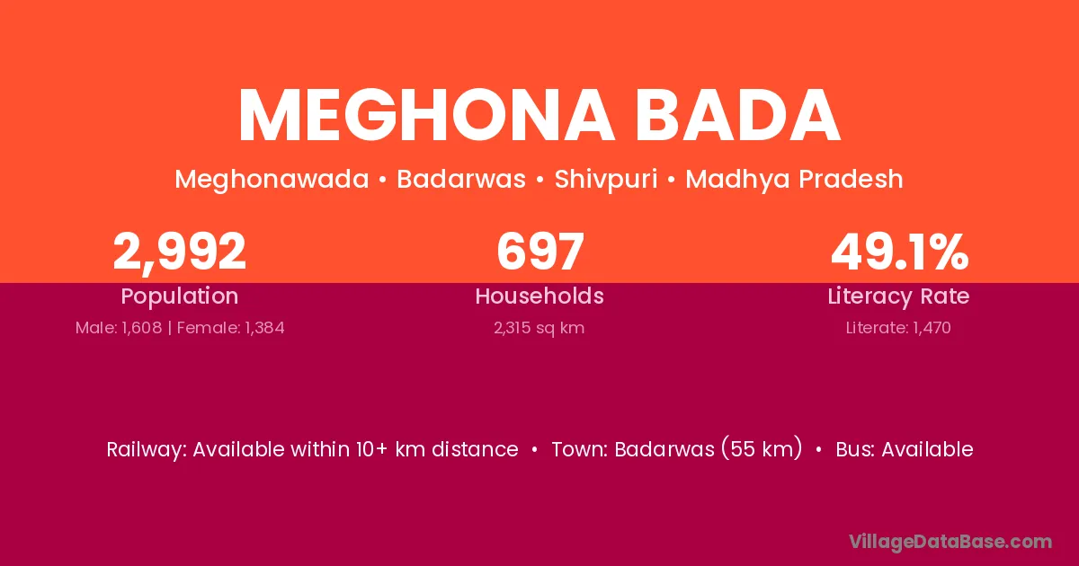 Badarwas (55 km) is the nearest town to Meghona Bada village for major economic activities and is located approximately 55 km away.