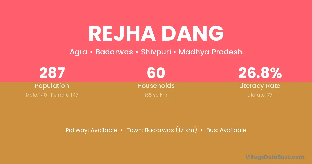 Badarwas (17 km) is the nearest town to Rejha Dang village for major economic activities and is located approximately 17 km away.