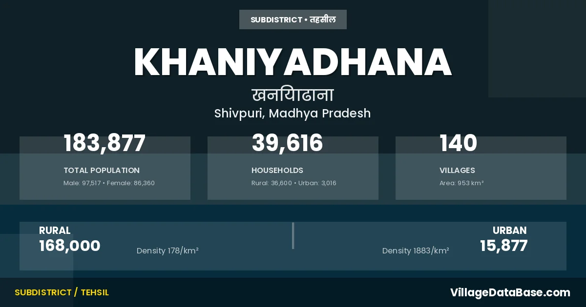 According to the 2011 census The total area of Khaniyadhana Tehsil is 953 km², with a population of 183877 people. The population density is 193 inhabitants per square kilometre, and there are approximately 39616 houses in the sub district.