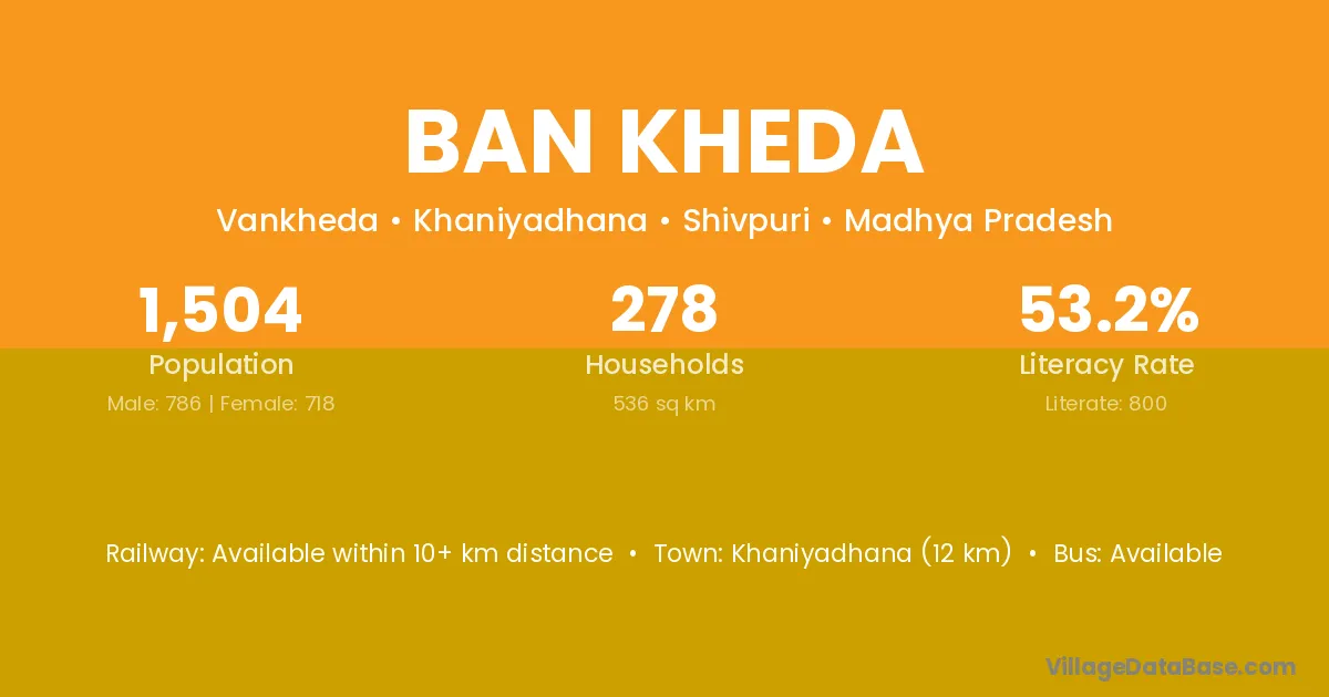 Ban Kheda village has a total population of 1,504 people, of which 786 are males and 718 are females.