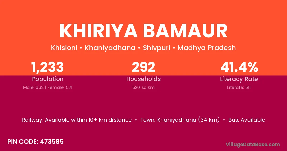 Khiriya Bamaur village has a total population of 1,233 people, of which 662 are males and 571 are females.