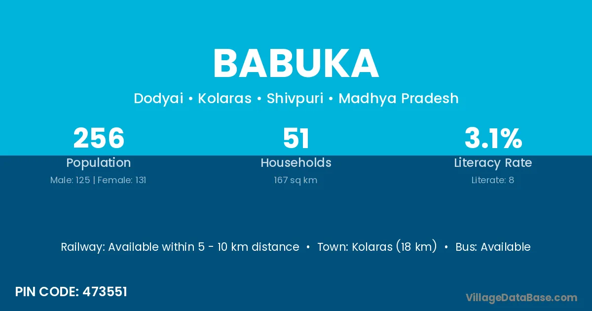 Kolaras (18 km) is the nearest town to Babuka village for major economic activities and is located approximately 18 km away.