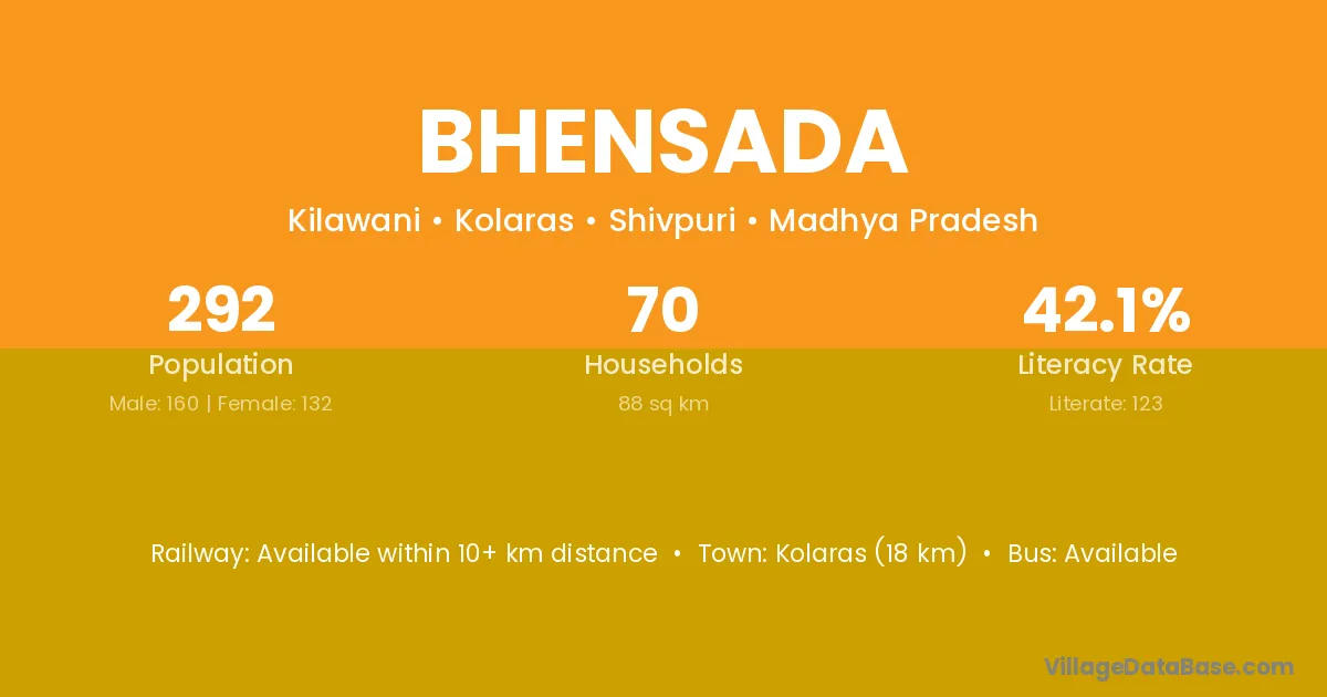 Kolaras (18 km) is the nearest town to Bhensada village for major economic activities and is located approximately 18 km away.