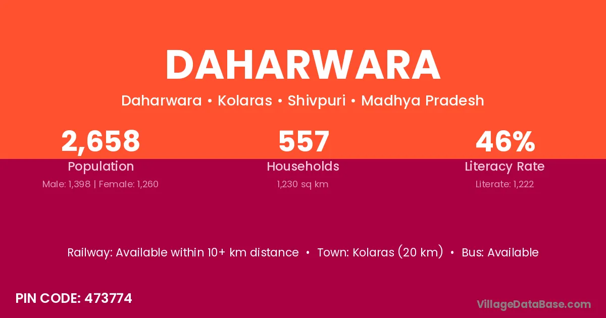 Kolaras (20 km) is the nearest town to Daharwara village for major economic activities and is located approximately 20 km away.