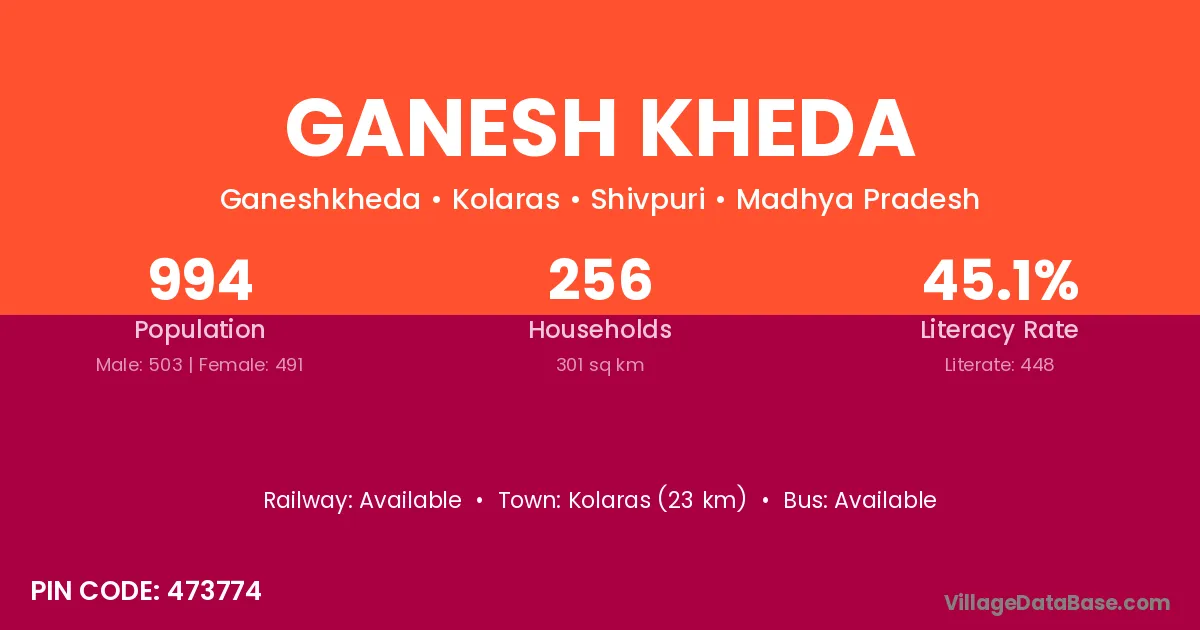 Ganesh Kheda village has a total population of 994 people, of which 503 are males and 491 are females.