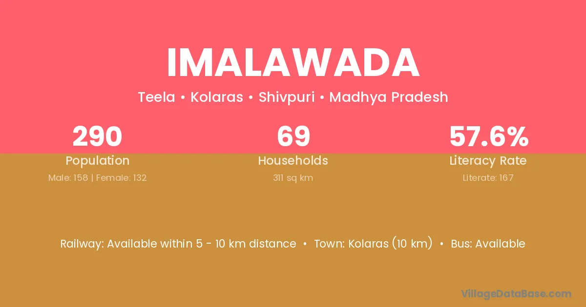 Kolaras (10 km) is the nearest town to Imalawada village for major economic activities and is located approximately 10 km away.