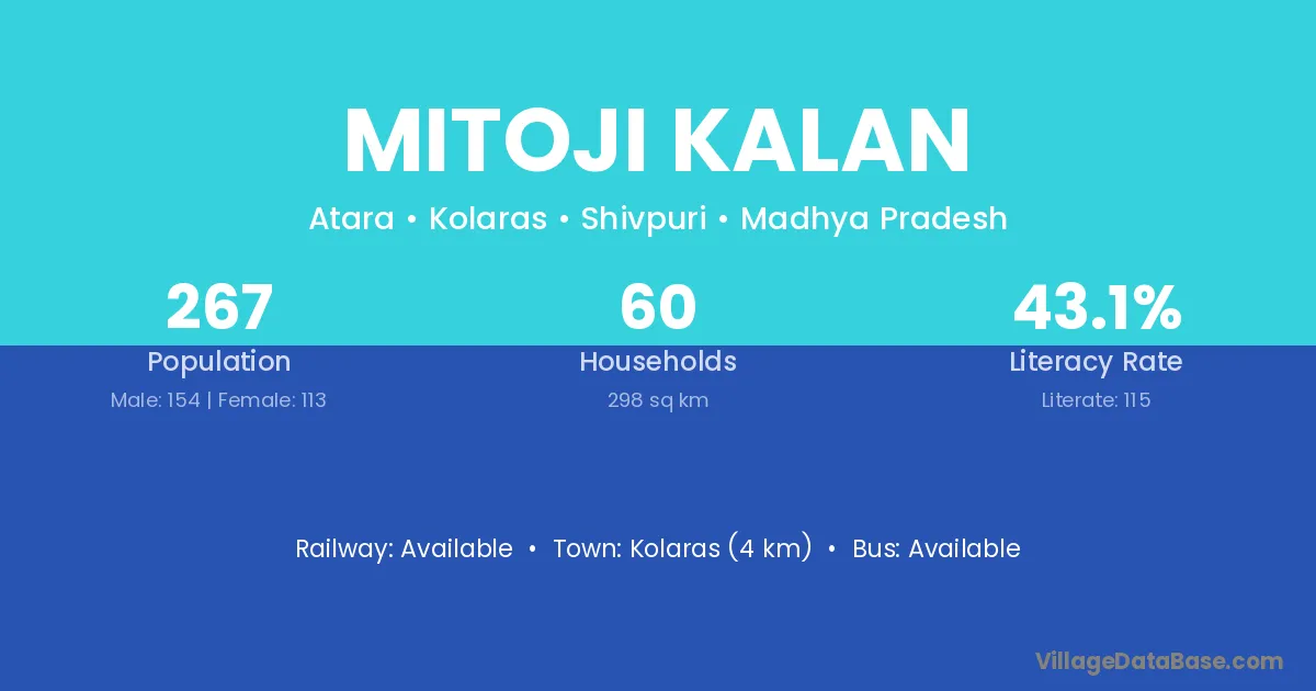 Kolaras (4 km) is the nearest town to Mitoji Kalan village for major economic activities and is located approximately 4 km away.