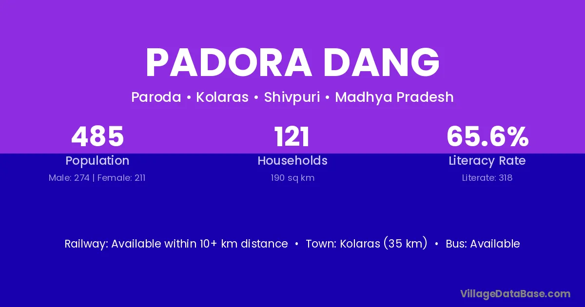 Kolaras (35 km) is the nearest town to Padora Dang village for major economic activities and is located approximately 35 km away.