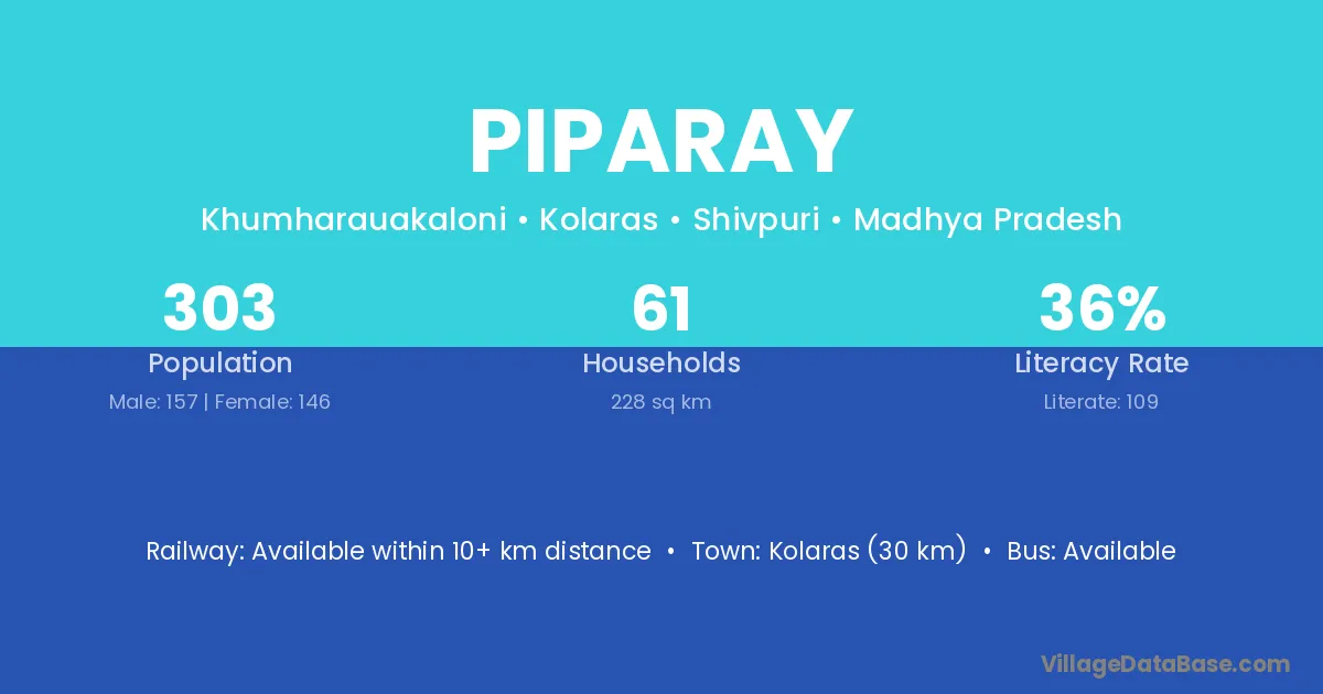 Kolaras (30 km) is the nearest town to Piparay village for major economic activities and is located approximately 30 km away.