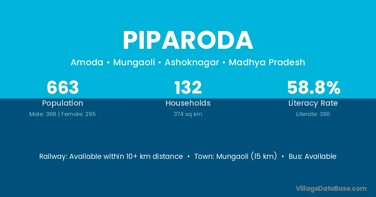 Kolaras (25 km) is the nearest town to Piparoda village for major economic activities and is located approximately 25 km away.