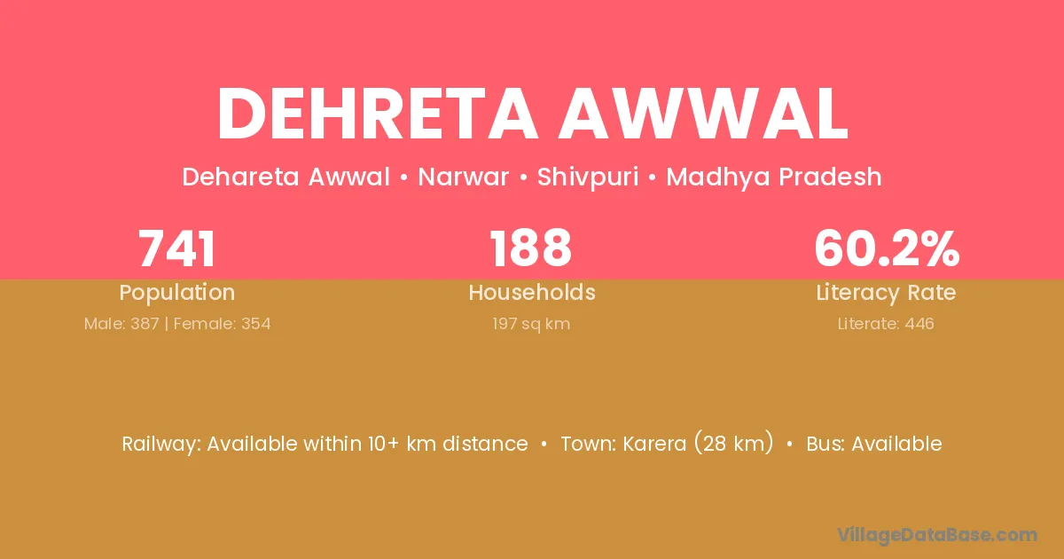 Karera (28 km) is the nearest town to Dehreta Awwal village for major economic activities and is located approximately 28 km away.