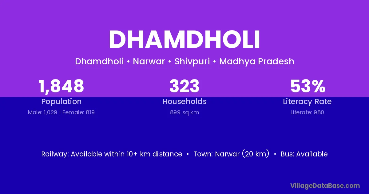 Narwar (20 km) is the nearest town to Dhamdholi village for major economic activities and is located approximately 20 km away.