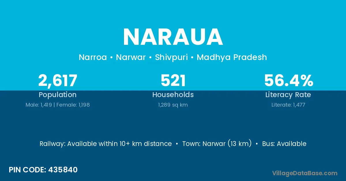 Narwar (13 km) is the nearest town to Naraua village for major economic activities and is located approximately 13 km away.