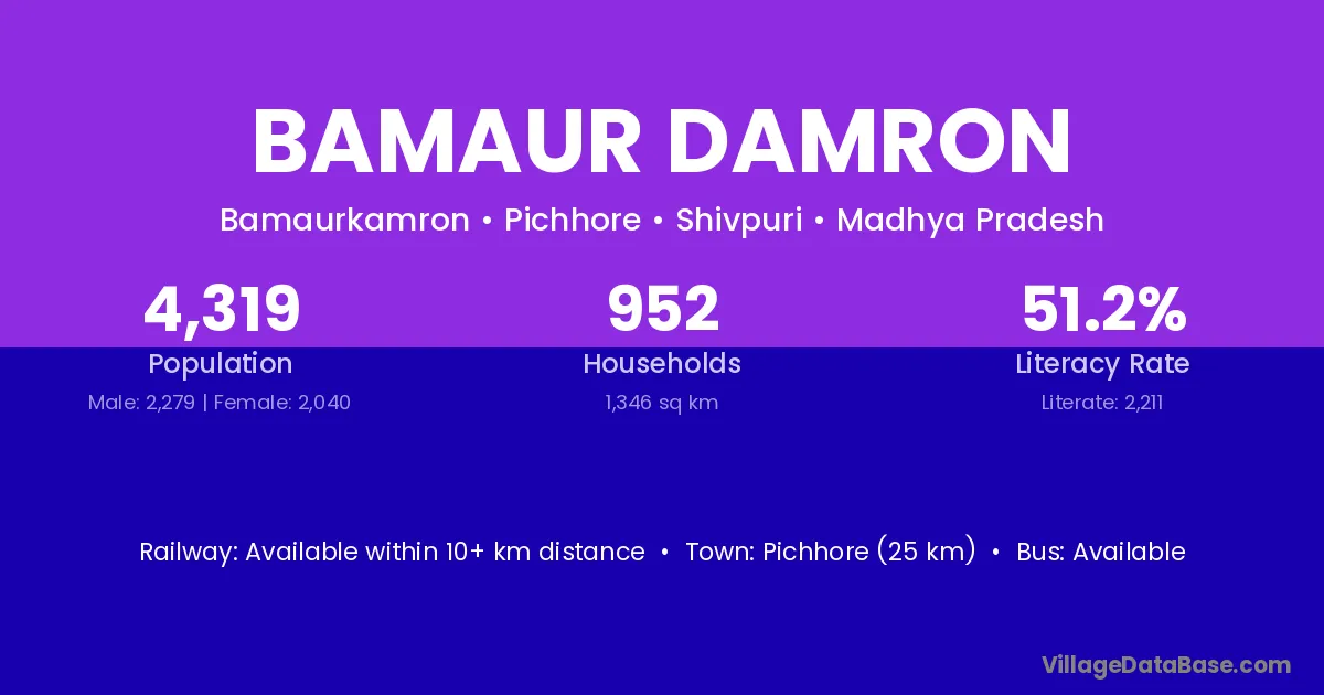 Pichhore (25 km) is the nearest town to Bamaur Damron village for major economic activities and is located approximately 25 km away.