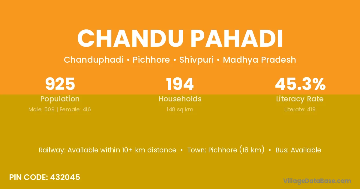 Pichhore (18 km) is the nearest town to Chandu Pahadi village for major economic activities and is located approximately 18 km away.