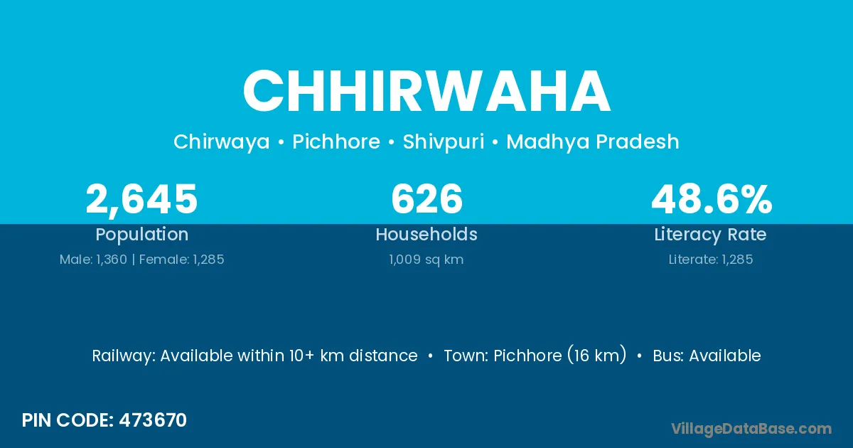 Pichhore (16 km) is the nearest town to Chhirwaha village for major economic activities and is located approximately 16 km away.