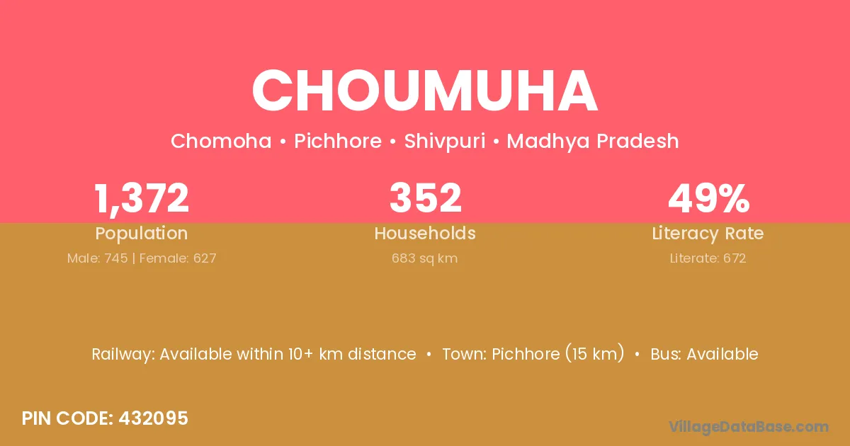 Pichhore (15 km) is the nearest town to Choumuha village for major economic activities and is located approximately 15 km away.
