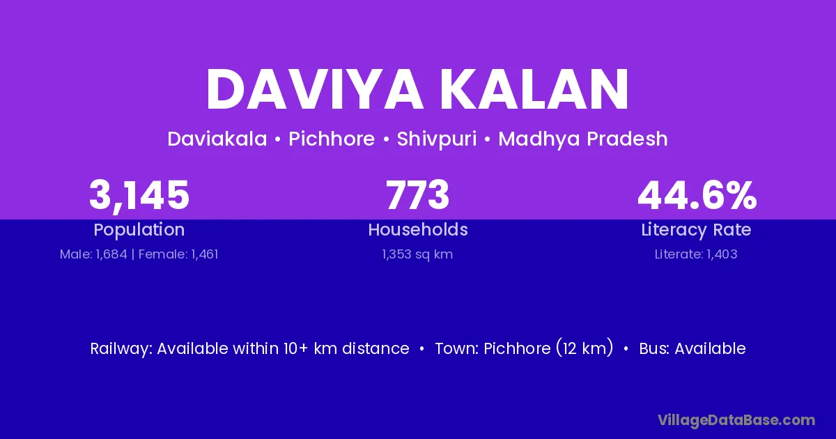 Pichhore (12 km) is the nearest town to Daviya Kalan village for major economic activities and is located approximately 12 km away.