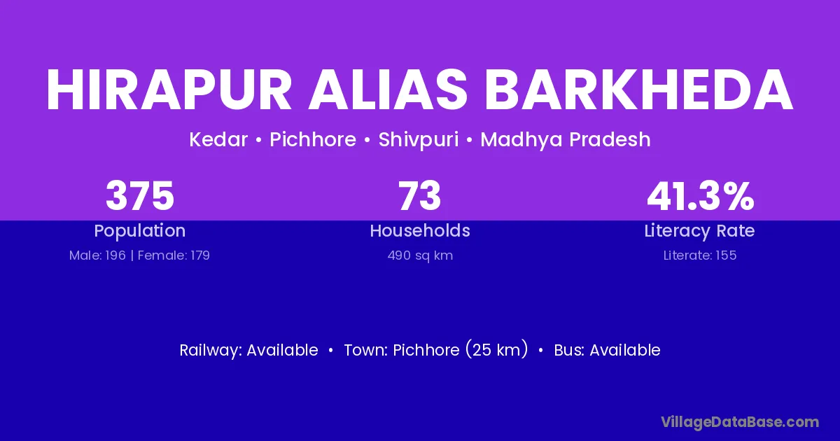 Hirapur Alias Barkheda village has a total population of 375 people, of which 196 are males and 179 are females.