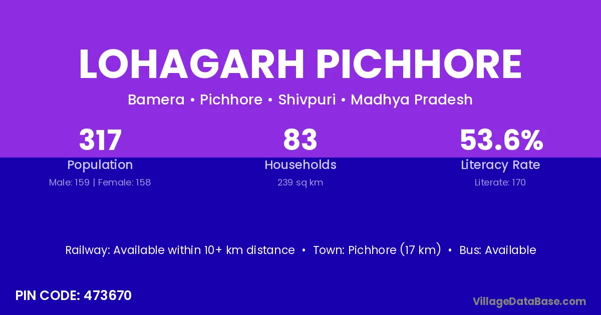 Pichhore (17 km) is the nearest town to Lohagarh Pichhore village for major economic activities and is located approximately 17 km away.