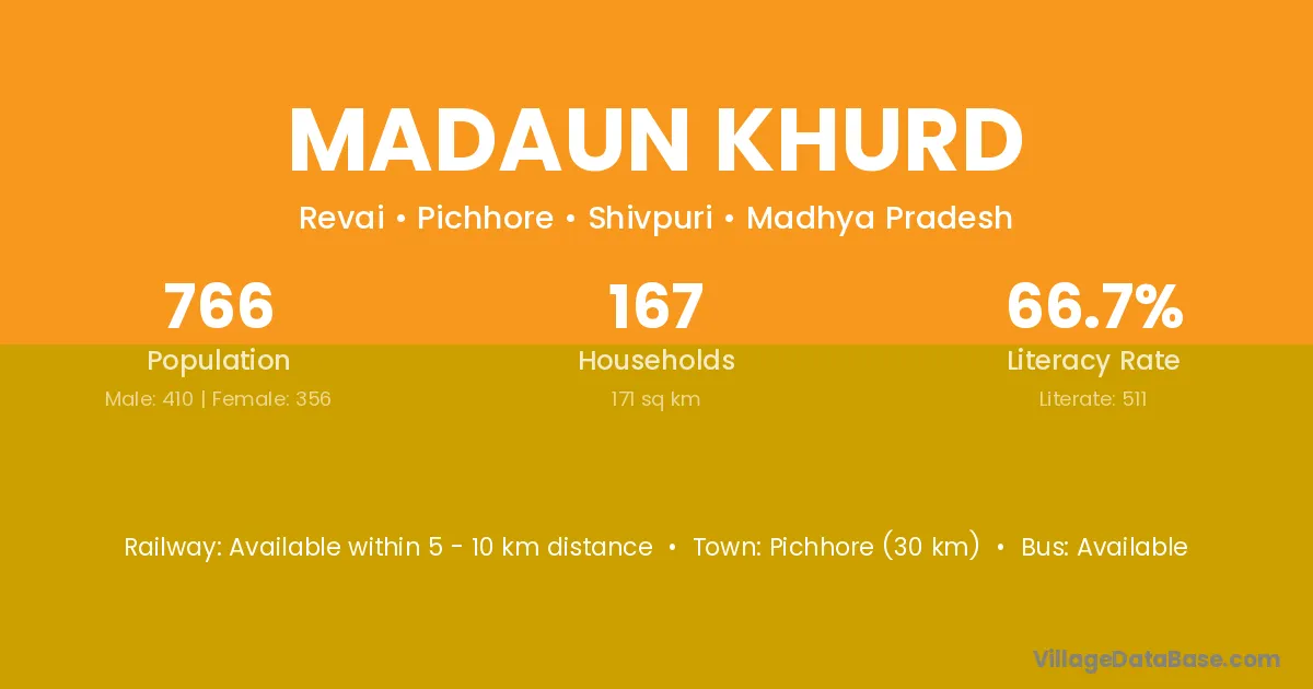 Pichhore (30 km) is the nearest town to Madaun Khurd village for major economic activities and is located approximately 30 km away.