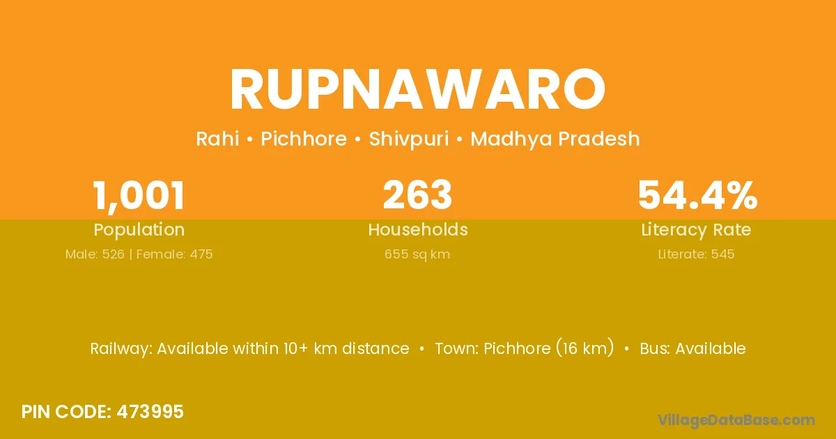 Pichhore (16 km) is the nearest town to Rupnawaro village for major economic activities and is located approximately 16 km away.