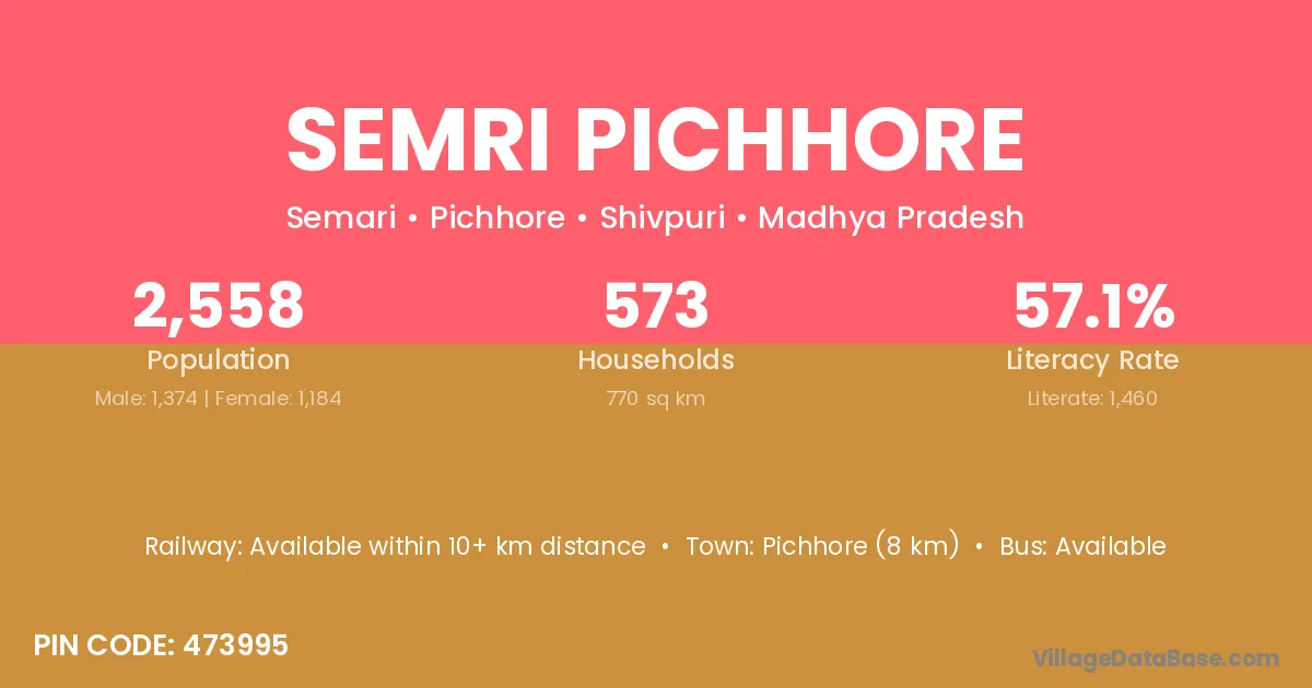 Pichhore (8 km) is the nearest town to Semri Pichhore village for major economic activities and is located approximately 8 km away.