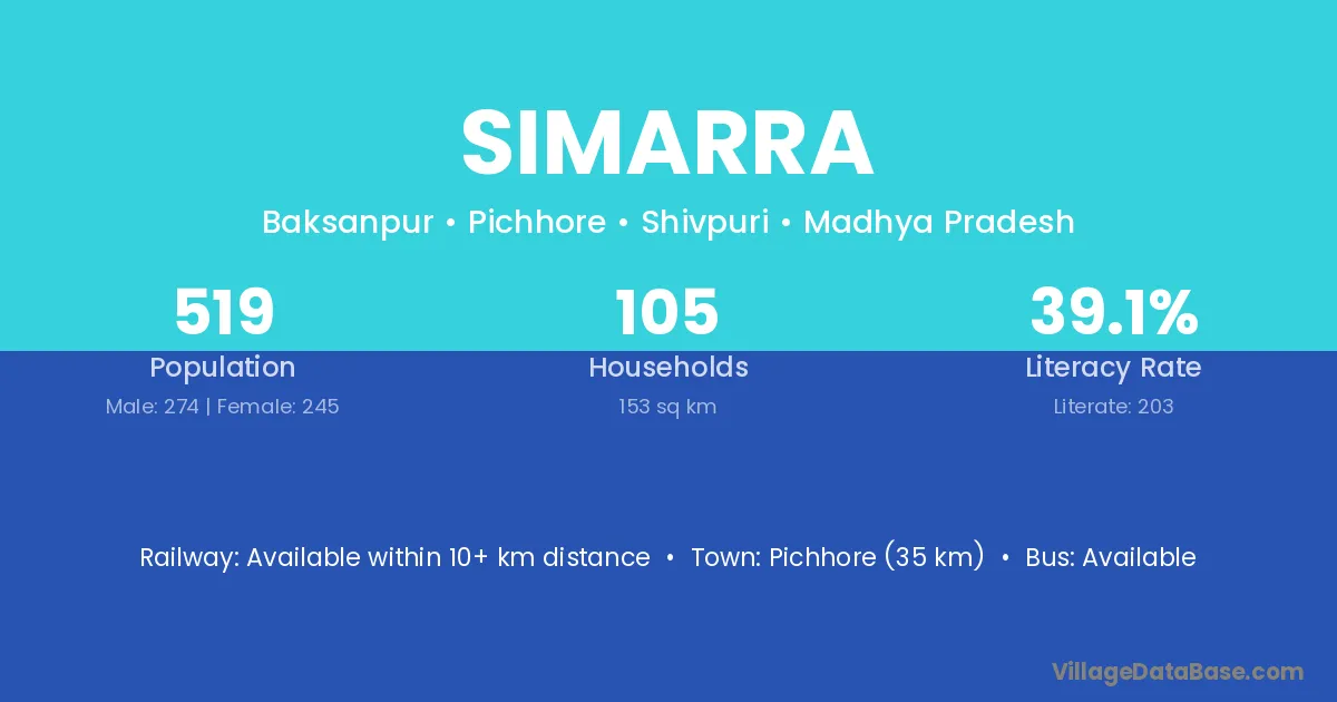 Pichhore (35 km) is the nearest town to Simarra village for major economic activities and is located approximately 35 km away.