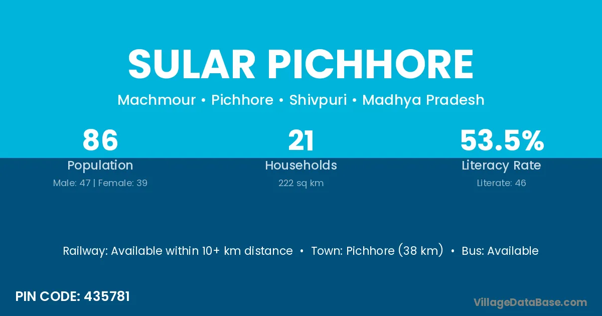 Pichhore (38 km) is the nearest town to Sular Pichhore village for major economic activities and is located approximately 38 km away.