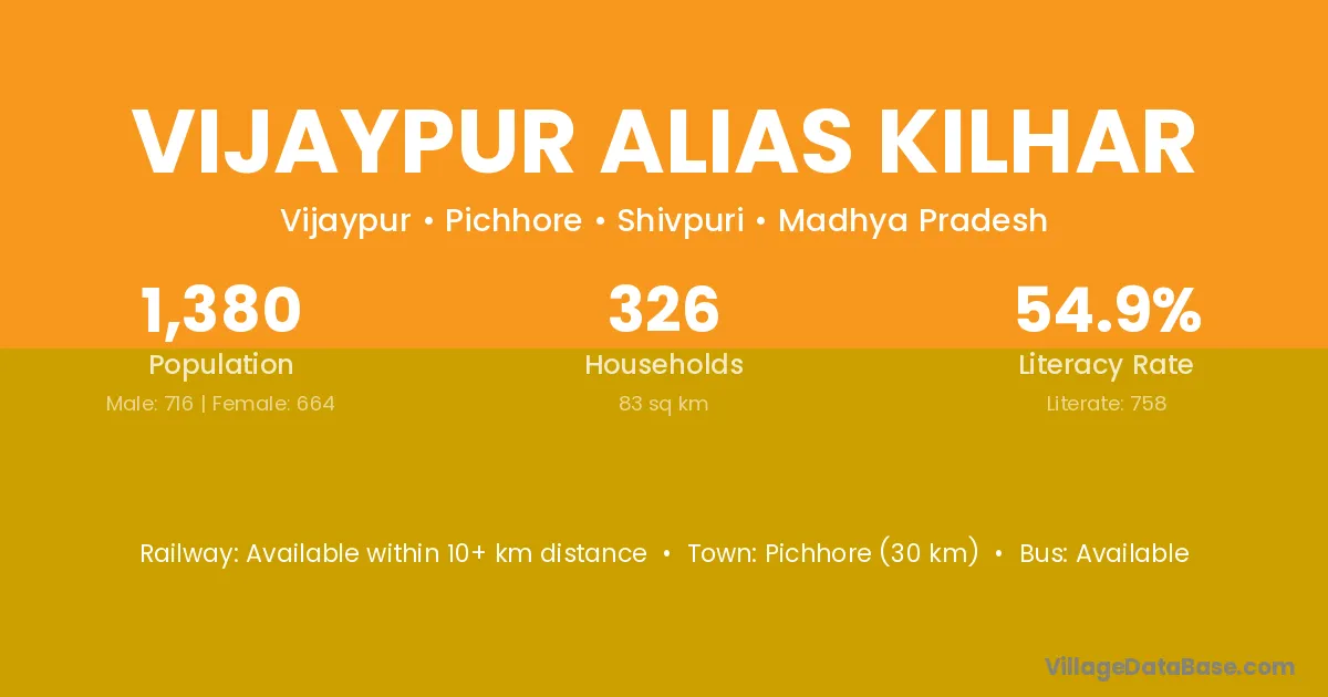 Pichhore (30 km) is the nearest town to Vijaypur Alias Kilhar village for major economic activities and is located approximately 30 km away.
