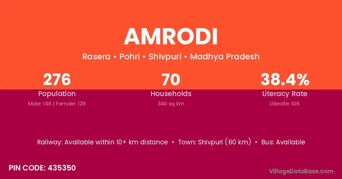 Shivpuri (60 km) is the nearest town to Amrodi village for major economic activities and is located approximately 60 km away.