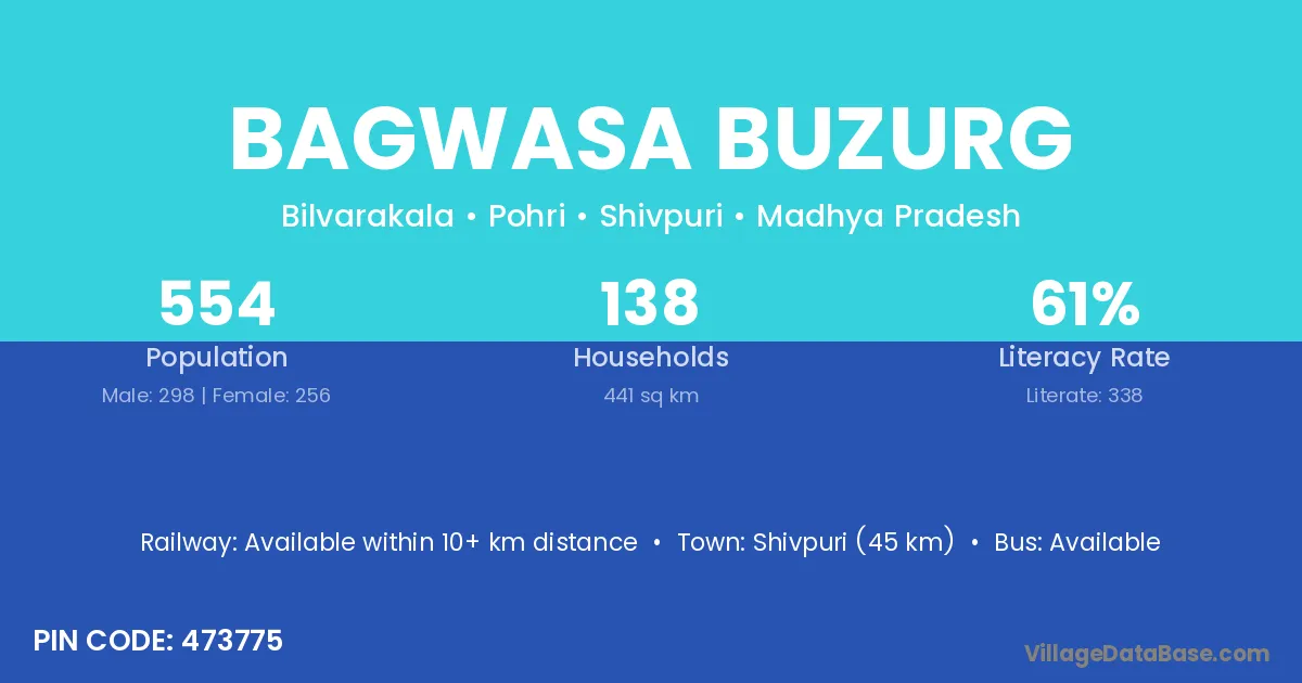 Shivpuri (45 km) is the nearest town to Bagwasa Buzurg village for major economic activities and is located approximately 45 km away.