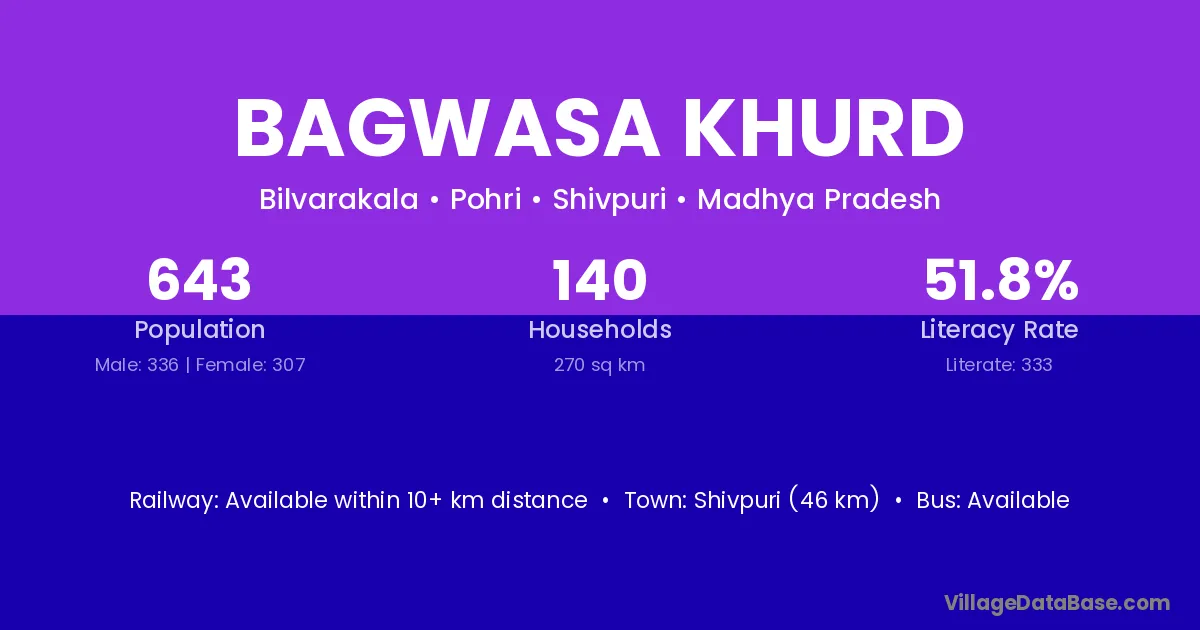 Bagwasa Khurd village has a total population of 643 people, of which 336 are males and 307 are females.