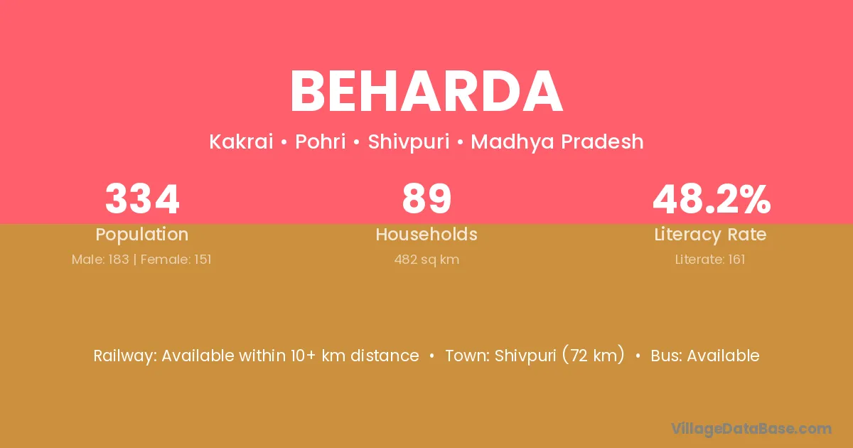 Shivpuri (72 km) is the nearest town to Beharda village for major economic activities and is located approximately 72 km away.