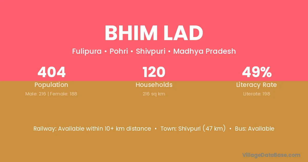 Shivpuri (47 km) is the nearest town to Bhim Lad village for major economic activities and is located approximately 47 km away.