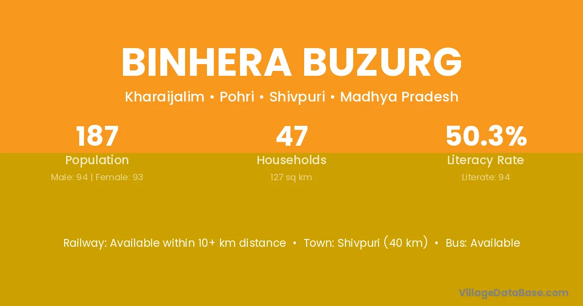 Shivpuri (40 km) is the nearest town to Binhera Buzurg village for major economic activities and is located approximately 40 km away.