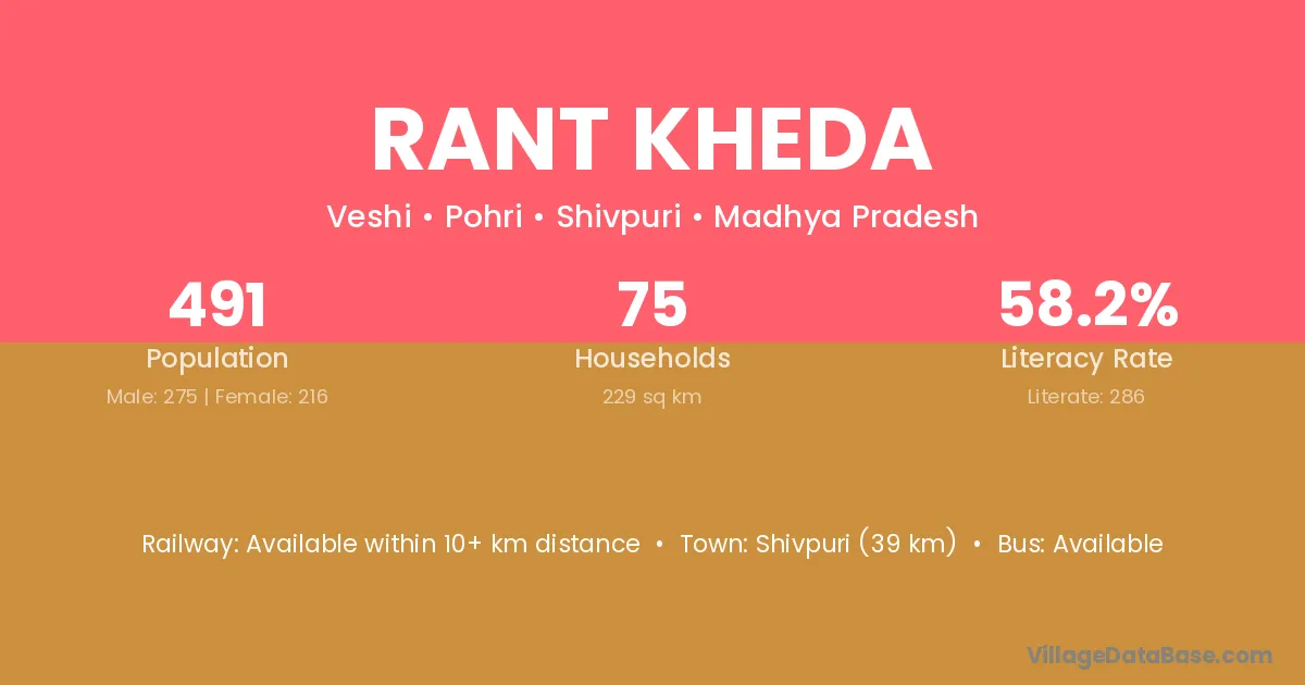 Rant Kheda village has a total population of 491 people, of which 275 are males and 216 are females.