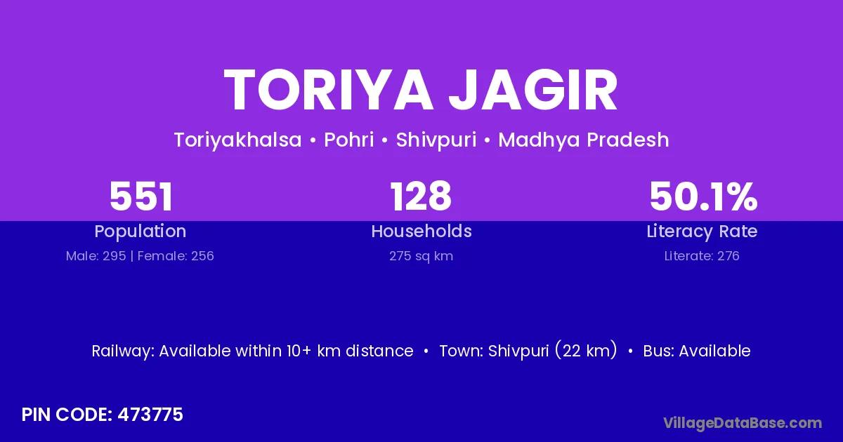 Shivpuri (22 km) is the nearest town to Toriya Jagir village for major economic activities and is located approximately 22 km away.