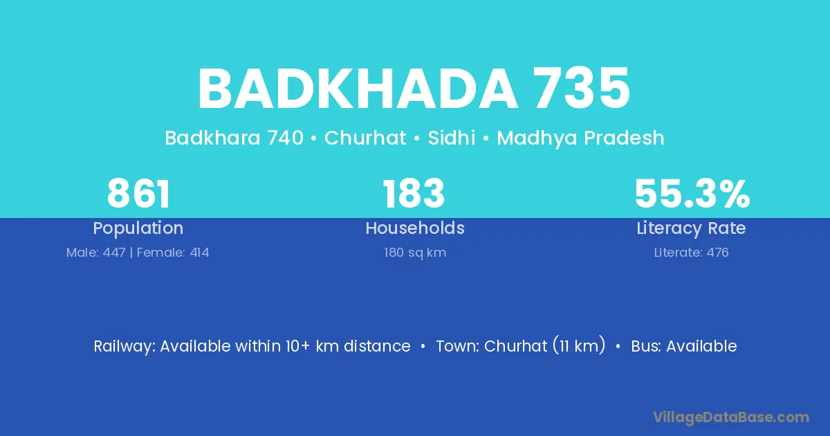 Badkhada 735 village has a total population of 861 people, of which 447 are males and 414 are females.