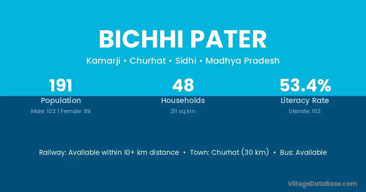 Bichhi Pater village has a total population of 191 people, of which 102 are males and 89 are females.
