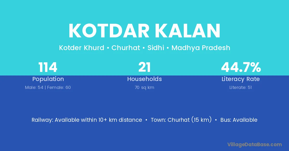 Kotdar Kalan village has a total population of 114 people, of which 54 are males and 60 are females.