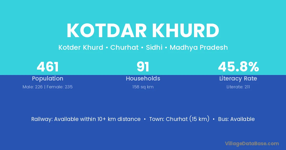 Kotdar Khurd village has a total population of 461 people, of which 226 are males and 235 are females.
