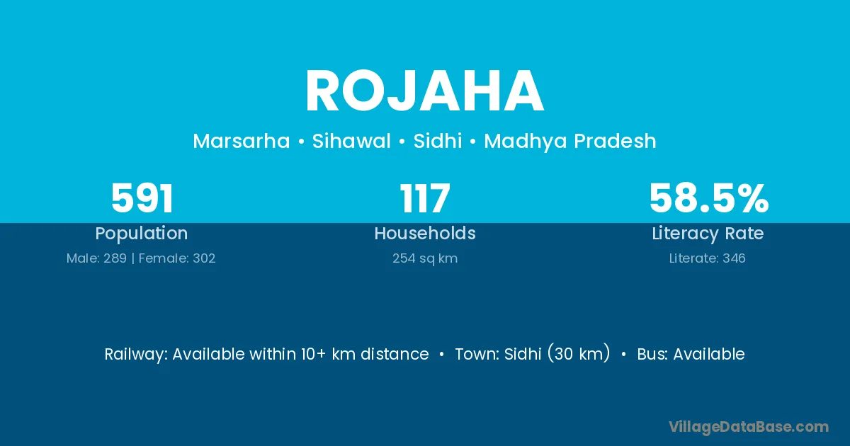 The literacy rate of Rojaha village is 59.35%. Male literacy stands at 68.42% and female literacy at 49.00%.