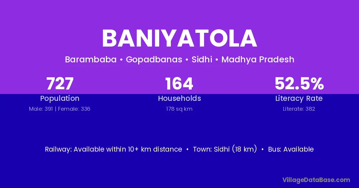 Sidhi (18 km) is the nearest town to Baniyatola village for major economic activities and is located approximately 18 km away.