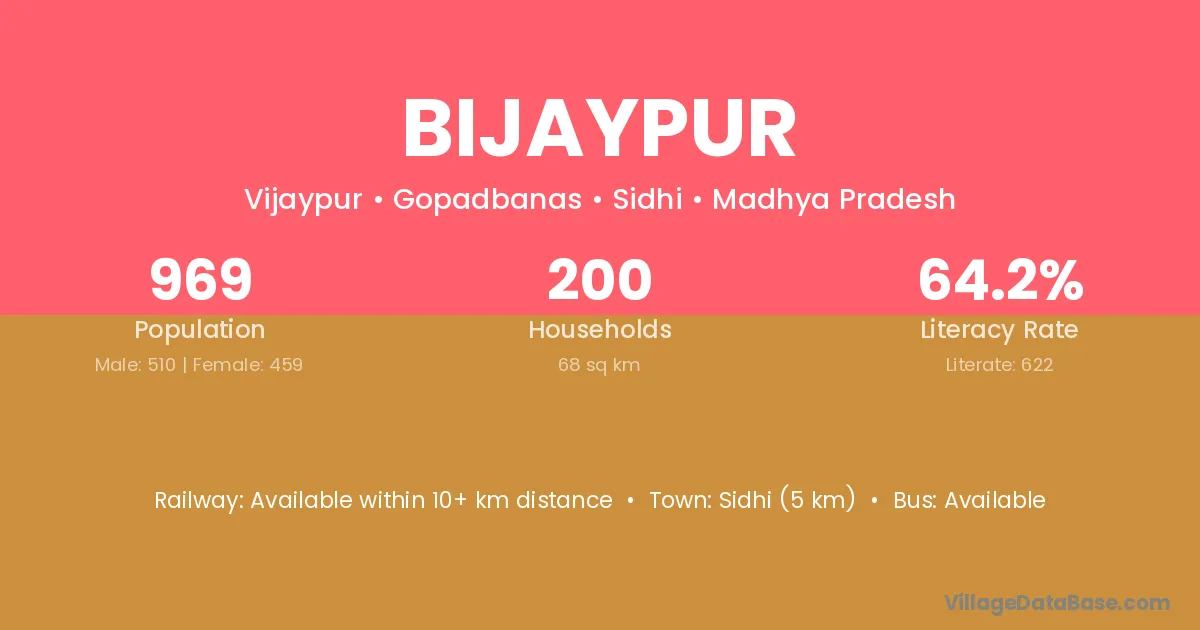 Bijaypur village has a total population of 969 people, of which 510 are males and 459 are females.